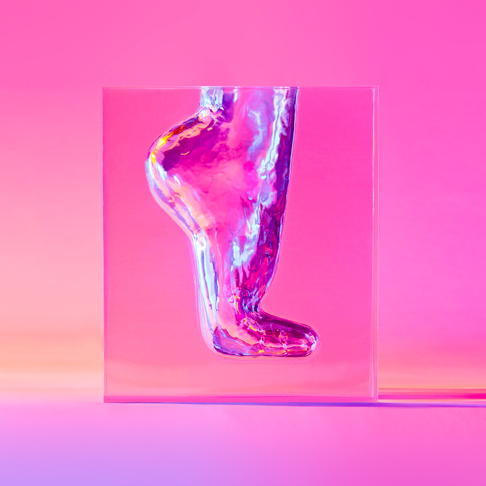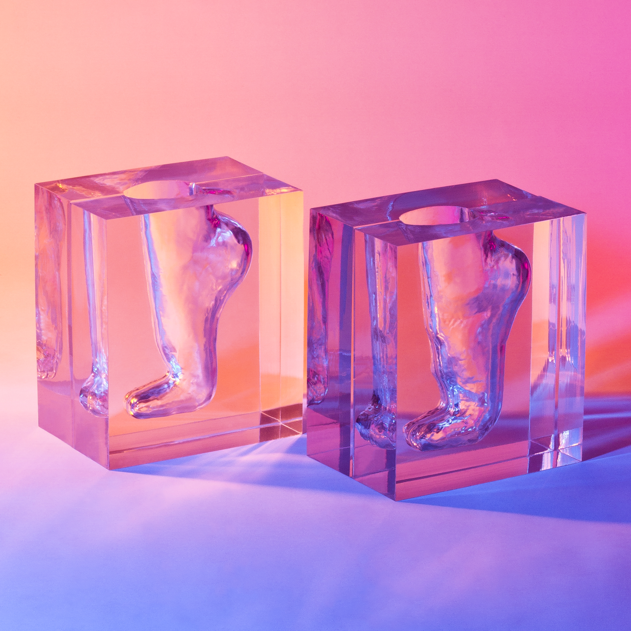 Made out of crystal clear resin layered around a silicone mold of the artist’s demi-pointed foot, these two shoes each separate in equal halves closing onto each other.